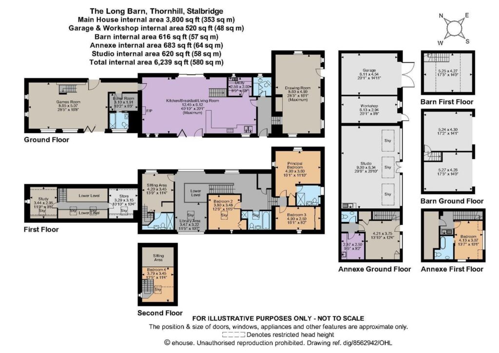 See Floor Plan. Many areas have double height ceilings, easy flowing landing and highly manageable gardens. The artist studio has north facing light with vaulted ceilings and under floor heating. Main House: Entrance hall; drawing room; kitchen / dining / living; utility room; guest WC; boot room; games room; principal bedroom suite; bedroom 2; bedroom 3; family bathroom; mezzanine bedroom 4 with sitting room; study; store along board walk. Outbuildings: Artist studio; annexe with sitting room; guest WC; kitchen; bedroom suite; storage; garage with barn door; barn / car port with storage above one side Outside: Level lawns with ornamental pond; parking for 6 cars; rainwater harvesting; solar panels; air source heat pumps; more parking outside for annexe to side. Large grass verge to front.