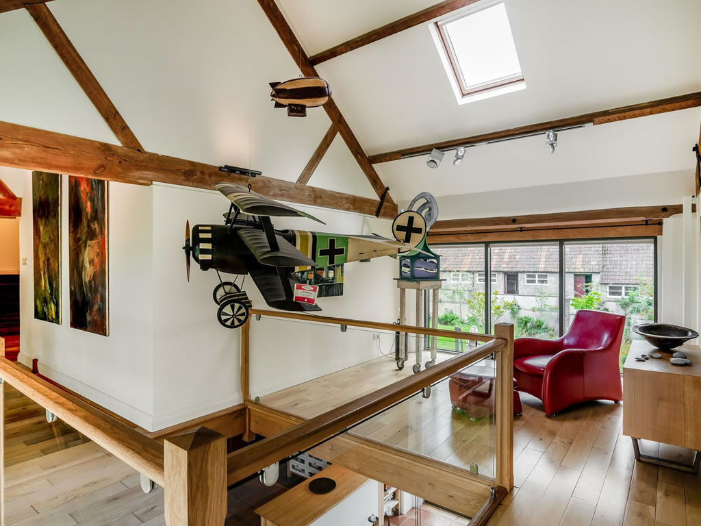 The house, itself, has a vast central kitchen / living / dining room with wood burning stove and bi-fold doors to the garden and a double height atrium. To one end is a substantial drawing room, currently used as an office, and at the other end it is set up as a games room with a plethora of bookshelves and further access to the garden. Above the games room is a study with Blackmore Vale views and a store room across the board walk.